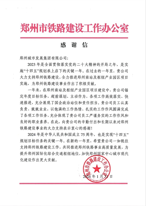 同時,城發(fā)集團大力支持鄭州鐵路建設,全力推進鄭州南站及樞紐產(chǎn)業(yè)園項目實施,超前謀劃、主動作為,各項工作高效落實、快速推進,充分展現(xiàn)了國企政治站位和責任擔當。做一件好事,添一份美麗 ,再收到鄭州市鐵路建設工作辦公室的感謝信!