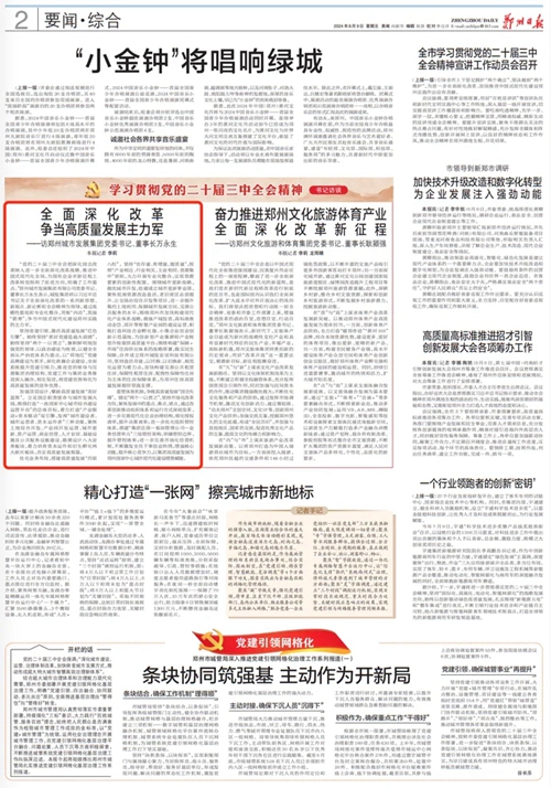 “黨的二十屆三中全會把深化國企改革納入進一步全面深化改革戰(zhàn)略、推進中國式現(xiàn)代化全局,為國有企業(yè)在新征程上改革轉(zhuǎn)型指明了前進方向,明確了工作重點。”鄭州城市發(fā)展集團有限公司黨委書記、董事長萬永生表示,城發(fā)集團將以習近平總書記關(guān)于全面深化改革的一系列新思想、新觀點、新論斷和全會精神為指導,通過戰(zhàn)略性重組和專業(yè)化整合,苦練“內(nèi)功”,筑強“筋骨”,爭當中國式現(xiàn)代化建設鄭州實踐的主力軍。