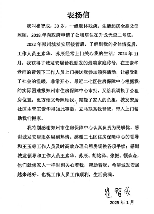 1月9日清晨,崔老師一家分別向住保中心、城發(fā)安居贈(zèng)送了錦旗,并送來(lái)一封表?yè)P(yáng)信,對(duì)住保中心所展現(xiàn)的認(rèn)真負(fù)責(zé)態(tài)度以及為民解憂的卓越作風(fēng)表達(dá)了高度贊揚(yáng),同時(shí)也對(duì)城發(fā)安居工作給予了肯定鼓勵(lì)。
