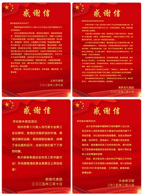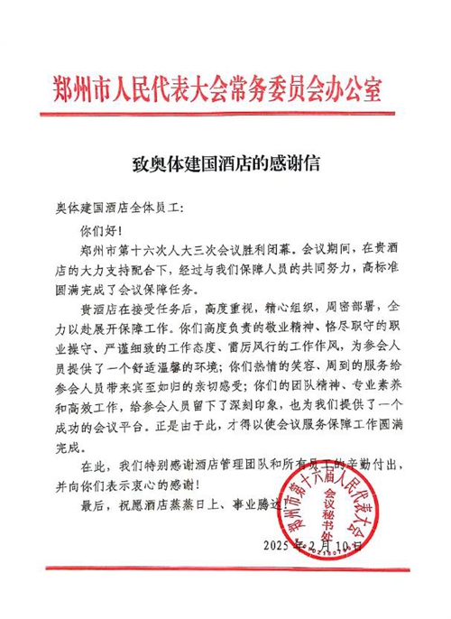 2025年2月10日,鄭州市第十六屆人民代表大會(huì)第三次會(huì)議第二次全體會(huì)議勝利閉幕。鄭州城市發(fā)展集團(tuán)旗下河南鄭地奧體建國(guó)飯店作為本次大會(huì)的駐地保障酒店,以“五星”服務(wù)標(biāo)準(zhǔn)(環(huán)境舒心、食宿貼心、細(xì)節(jié)暖心、保障安心、文化潤(rùn)心),圓滿(mǎn)完成了各項(xiàng)接待任務(wù),贏得了與會(huì)代表和會(huì)務(wù)組的一致好評(píng)。