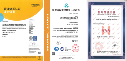 結(jié)合2019年取得的質(zhì)量管理體系(ISO9001),鄭房測繪已成功通過“三標(biāo)體系”認(rèn)證。這些榮譽(yù),不僅是公司在規(guī)范化運(yùn)營、風(fēng)險防控、精細(xì)化管理等維度交出的優(yōu)異答卷,更標(biāo)志著公司企業(yè)綜合實(shí)力和核心競爭力的增強(qiáng),顯著提升公司品牌形象與市場信譽(yù)度,增強(qiáng)客戶對企業(yè)的信任,為深耕測繪地理信息市場奠定堅實(shí)基礎(chǔ),為開啟管理升級與戰(zhàn)略躍升譜寫新篇章。