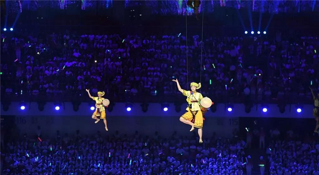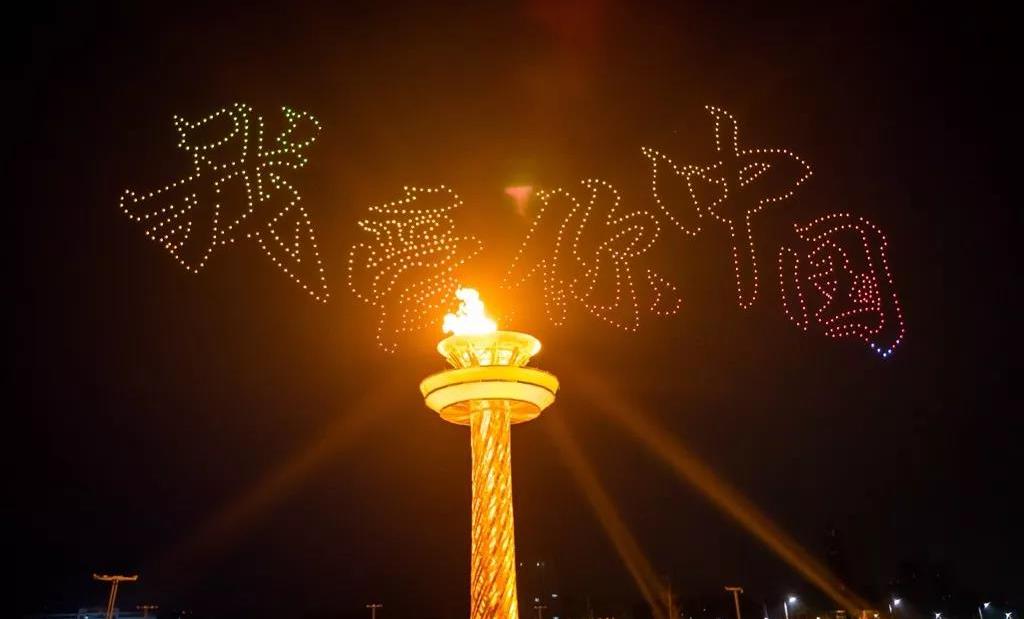 當(dāng)現(xiàn)場(chǎng)屏幕通過虛擬技術(shù)應(yīng)用,呈現(xiàn)出美麗的畫面,讓現(xiàn)場(chǎng)觀眾仿佛置身北國(guó)北川、南嶺飛瀑之中,觀眾都情不自禁地?fù)]舞起了手中的國(guó)旗為他們的表演喝彩!為我們偉大的祖國(guó)喝彩!1000架無人機(jī)從奧體中心廣場(chǎng)升起迅速變換成中中的造型,點(diǎn)燃民族運(yùn)動(dòng)會(huì)的火炬。
