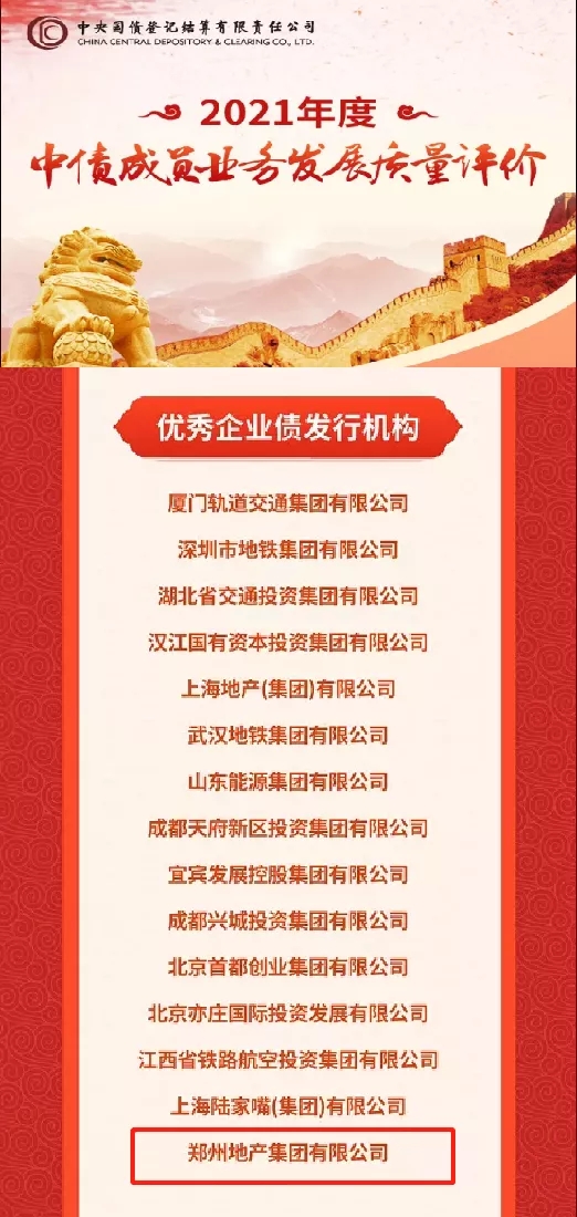 2022年1月4日,鄭州地產(chǎn)集團(tuán)獲評(píng)中央國(guó)債登記結(jié)算有限責(zé)任公司(以下簡(jiǎn)稱(chēng)中央結(jié)算公司)發(fā)布的2021年度中債成員業(yè)務(wù)發(fā)展質(zhì)量評(píng)價(jià)“優(yōu)秀企業(yè)債發(fā)行機(jī)構(gòu)”。