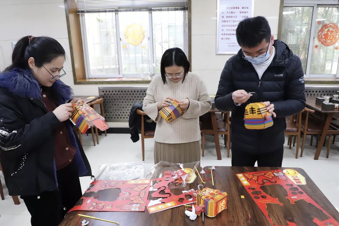在DIY手工燈籠制作時(shí),大家各自拿著半成品材料對(duì)照參考說明進(jìn)行粘貼制作。相互交流、相互指導(dǎo),通過一步步的搭建、固定、粘貼,最終象征著喜慶、團(tuán)圓的萌虎燈籠逐一呈現(xiàn)眼前。