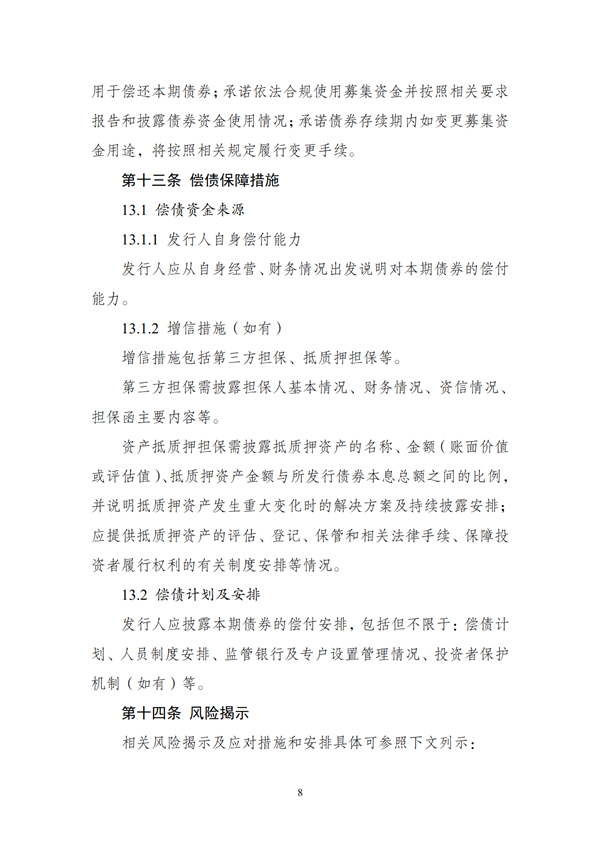 (二)發(fā)行人應(yīng)按照監(jiān)管部門和交易場(chǎng)所的規(guī)定,在存續(xù)期內(nèi)定期披露財(cái)務(wù)情況、經(jīng)營(yíng)情況、募集資金使用情況、項(xiàng)目進(jìn)展情況等相關(guān)信息。如存續(xù)期內(nèi)變更募集資金用途或發(fā)生其他對(duì)債券持有人權(quán)益有重大影響的事項(xiàng),應(yīng)符合相關(guān)法律法規(guī)和政策要求,按照有關(guān)規(guī)定或約定履行程序,并及時(shí)公告。